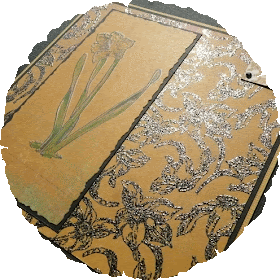 Today some daffodil cards made with the Cover a card Daffodil from Impression Obsession and a single Daffodil stamp also from IO designed by Aislin Adams, she draws beautiful flower images. The first one I've stamped on Basic Grey paper and coloured the main image with Derwent pencils. The Cover a card background has been embossed with Wow Black mixed with some Wow Sparkle brass. you can see that on the circle image above.