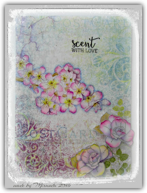 Gestempeld met diverse kleuren Memento dye inkten en Wow embossing poeders. De bloem geembosst met Wow silver regular en gekleurd met Tombo's. Hierboven ook weer de stempels genoemd met link naar IO. Ze zijn te koop bij de Posthumuswinkel in Amsterdam.